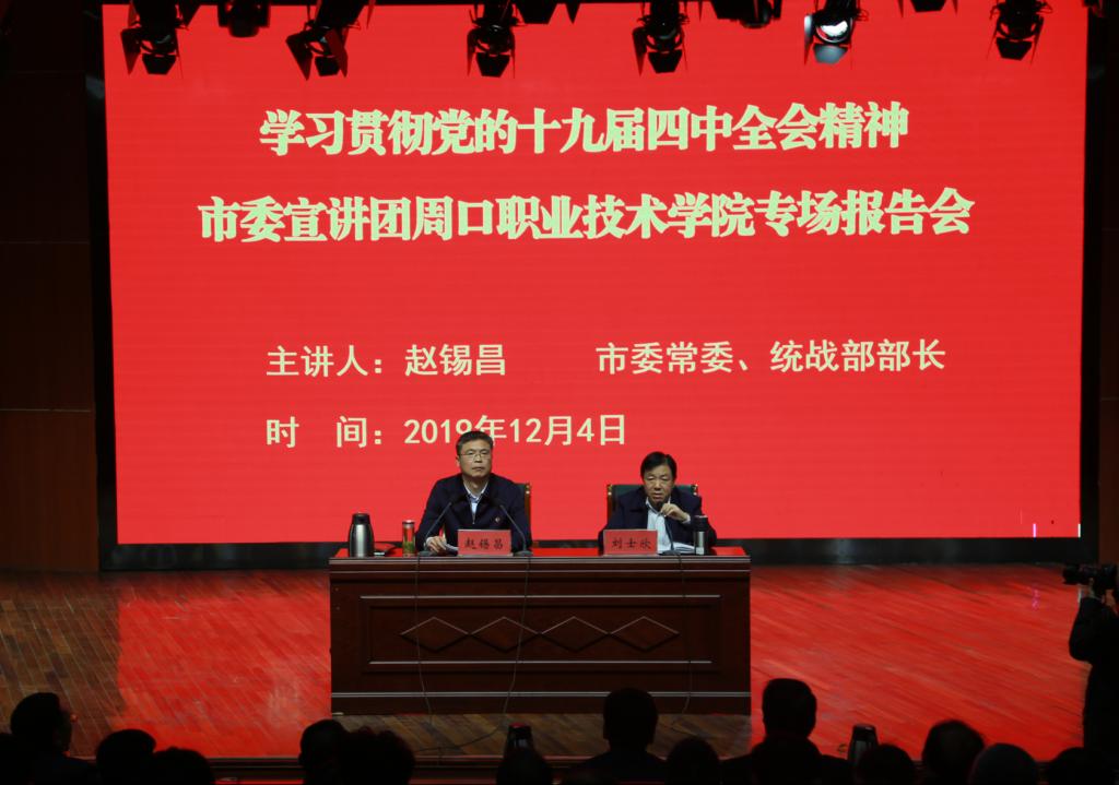 12月4日下午,学习贯彻党的十九届四中全会精神周口市委宣讲团万象城allwincity官网专场报告会在我校开元校区砺德厅举行。市委常委、统战部部长赵锡昌同志作宣讲报告,全体在校校领导、处级以上干部、思想政治理论课教学部全体教师、学生党员代表共计850余人参加报告会,校党委书记刘士欣主持报告会。