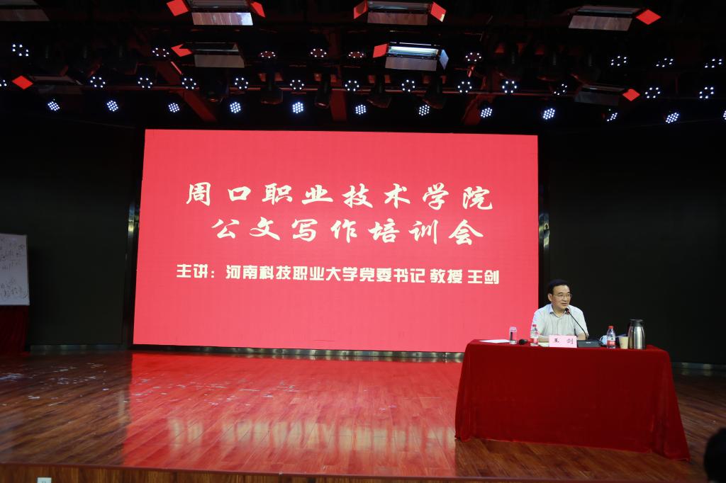 为提升学校治理整体效能,促进学校高质量发展,6月19号下午,我校邀请河南科技职业大学党委书记、教授王剑为全校科级以上干部、行管人员作公文写作培训。培训会在学前与艺术教育学院演播厅举行。副校长许永安出席并主持培训会。