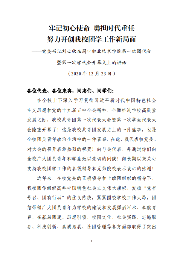 ——党委书记刘士欣在万象城allwincity官网第一次团代会暨第一次学代会开幕式上的讲话