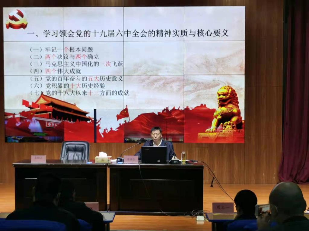 在报告中,李清臣分析解读了党的十九届六中全会的精神实质与核心要义,一是牢记一个根本问题;二是两个决议与两个确立;三是马克思主义中国化的三次飞跃;四是四个伟大成就;五是党的百年奋斗的五大历史意义;六是党积累的十大历史经验;七是党的十八大以来十三方面的成就。