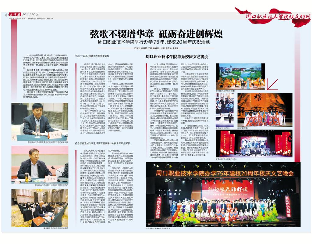 本次校庆特刊,由我校党委宣传部联合大河报周口运营中心策划实施。校庆活动开始前,我校宣传部工作人员多次与大河报周口运营中心沟通,就特刊采写、制作细节等进行深入细致地研究商讨,以求宣传效果走实、走心、入脑,达到润物无声、聚焦出彩的效果。