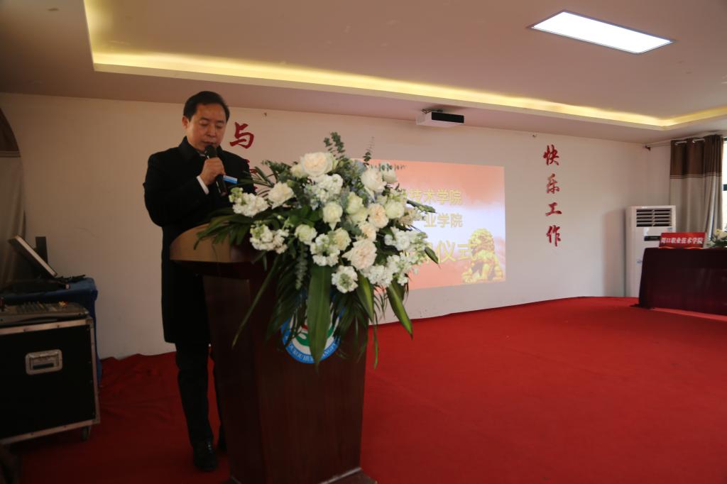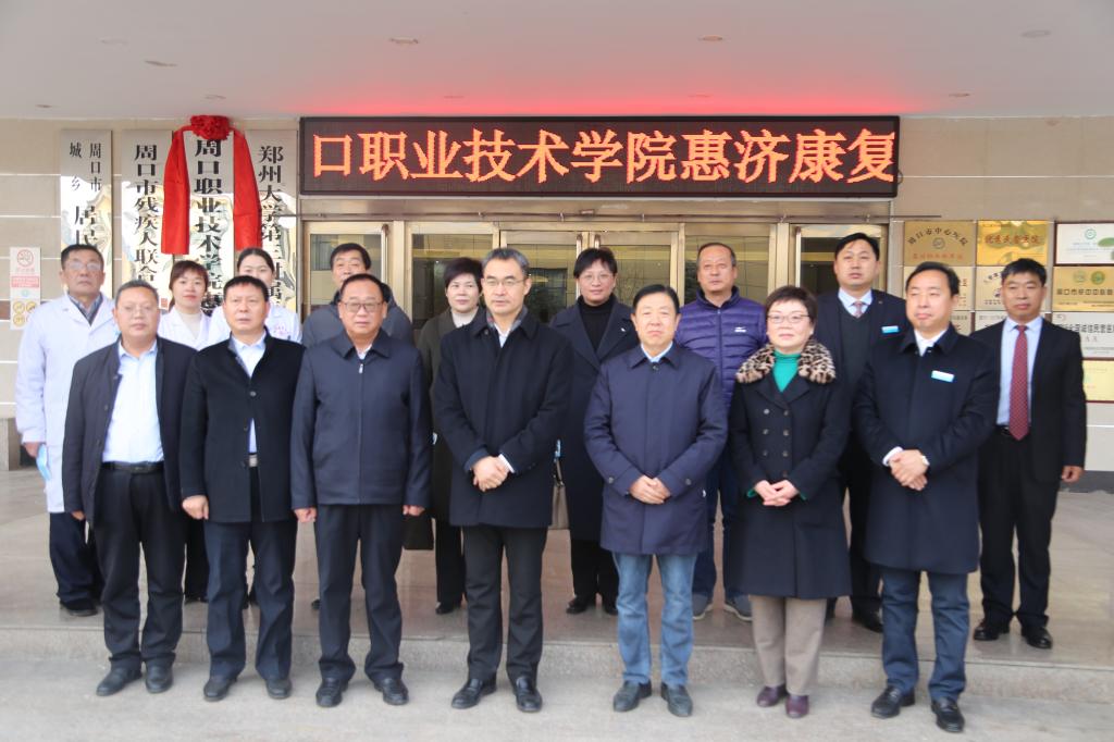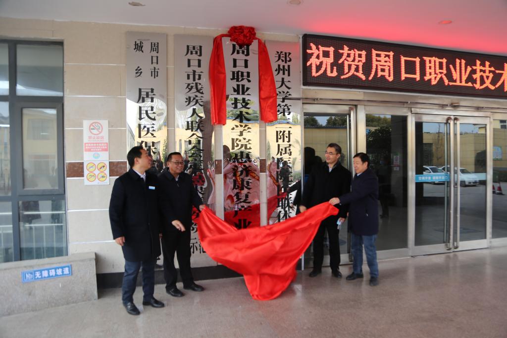 周口市副市长秦胜军,周口市政协副主席李应权,校党委书记刘士欣,周口惠济康复医院董事长、院长王希振共同为产业学院揭牌。