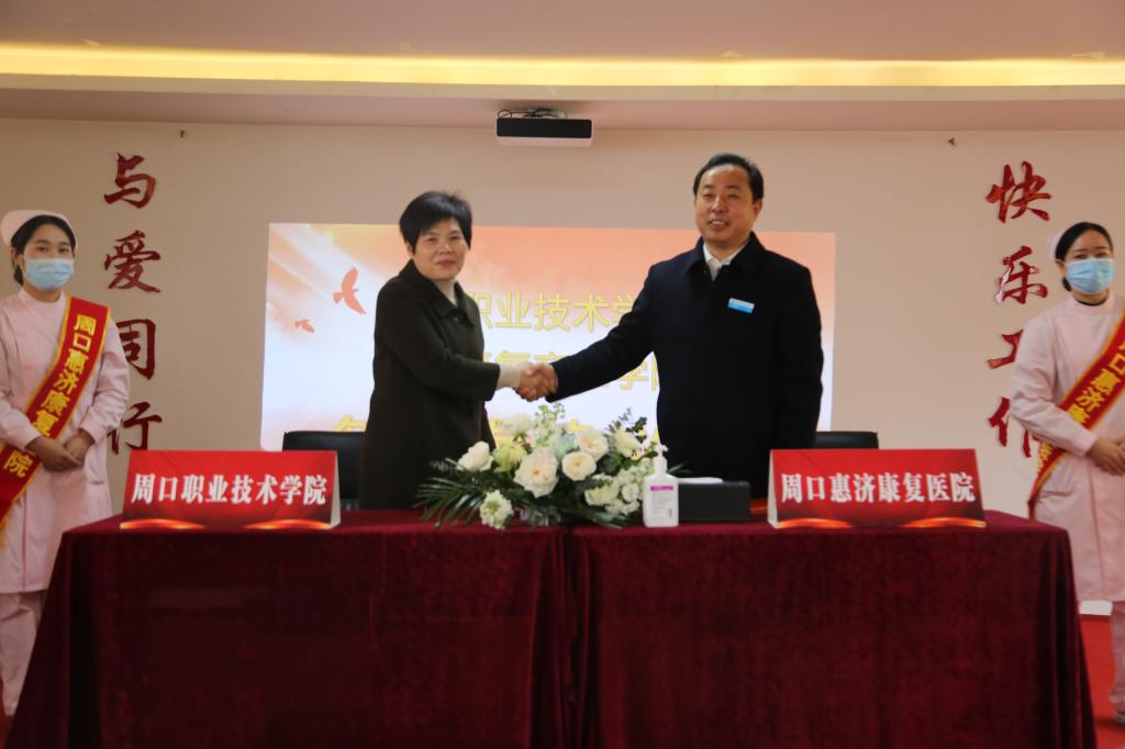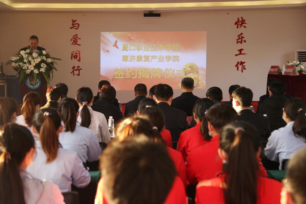 12月31日上午,我校在周口惠济康复医院举行万象城allwincity官网惠济康复产业学院签约揭牌仪式。周口市副市长秦胜军,周口市政协副主席李应权,周口市卫健委副主任张炎,校党委书记刘士欣,校长李清臣,副校长李明臣,周口惠济康复医院董事长、院长王希振出席仪式,学校及周口惠济康复医院相关部门负责人参加仪式。副校长李明臣主持签约揭牌仪式。